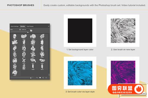 Photoshop 画笔是一种将纹理带入您的设计或创建自定义抽象背景的快速简便的方法。它们还允许您创建自定义颜色组合,以便您可以轻松地将抽象油漆背景与品牌颜色相匹配。(包括有关此的视频教程。)