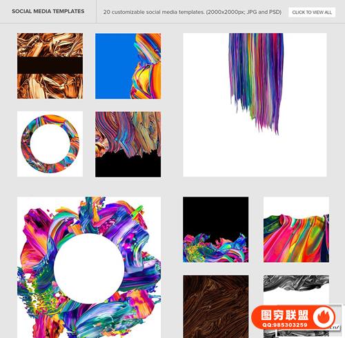 一个包含将抽象绘画带入您的设计所需的一切的包。透明背景、Photoshop 画笔、社交媒体模板、示例 PSD 和视频教程上的 100 幅高分辨率流体画。