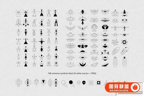 宇宙符号(108 个黑色 PNG、108 个白色 JPG+PNG 和矢量 AI+EPS 中的所有 108 个符号)– 2500×2500 像素