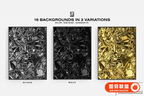 图穷联 » [图片素材]16款潮流黑金金属铝箔镀铬褶皱纹理背景图片素材 Alumen -Meta