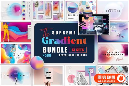 Supreme Gradient Bundle 包括我店里最好的 13 个渐变系列!大量渐变背景、液体形状、球体、模糊、地形元素、几何抽象将成为您设计工具箱的绝佳补充。我从我的商店中收集了 13 套,其中还包括了PDF。将它们用于数字和印刷材料和项目!