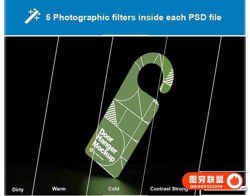 关于产品:Door Hanger In Dark Mockup 是一个样机,可以从不同的角度在深色背景中展示门把手挂牌,您可以将其用于您的设计,适用于品牌,并由单独的图层组组成。包含一个帮助文件。