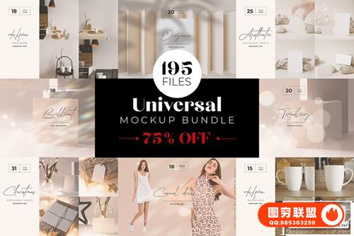 [PS样机]195+背景墙壁纸连衣裙圣诞卡片礼盒婚礼邀请函咖啡杯等PS样机合集漏光阴影照片PNG叠加素材 Universal Mockup Bundle
