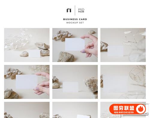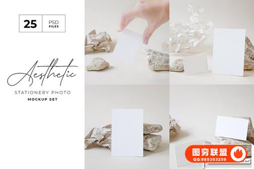 分层、可编辑的名片模型集和明信片模型集的 psd 文件,具有时尚的米色背景、石头和纸质装饰,准备展示您的定制设计,只需双击智能对象即可放置您的图案设计。