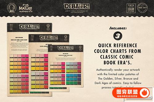 基于在漫画书出版的黄金、白银、青铜和黑暗时代使用的真实的前数字颜色公式和线条屏幕角度,我们构建了一个庞大的即用型图案样本、动作和纹理包,并配有将它们应用到您的工作中的简化过程。