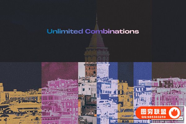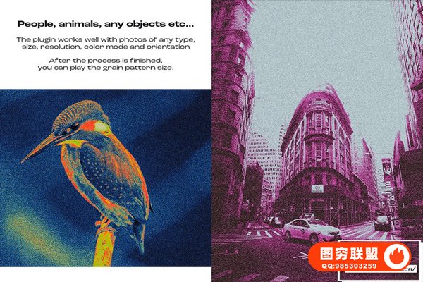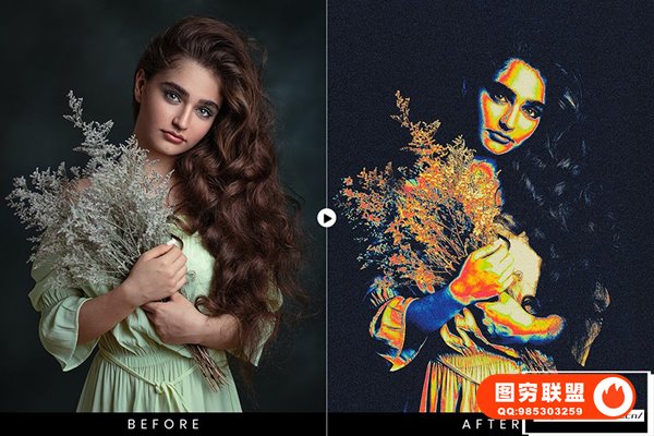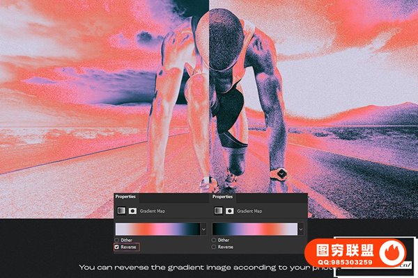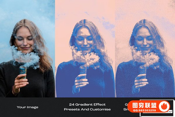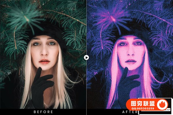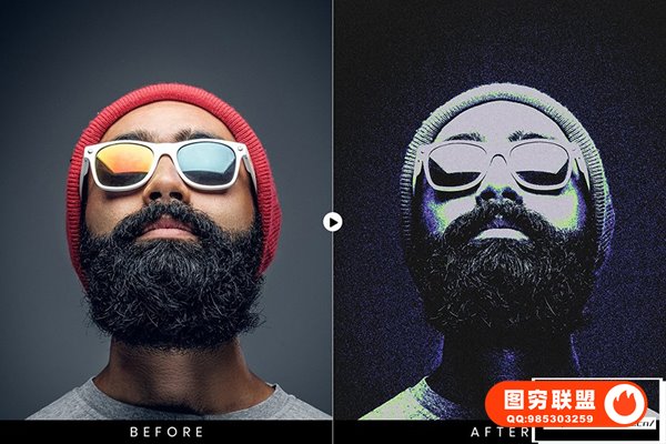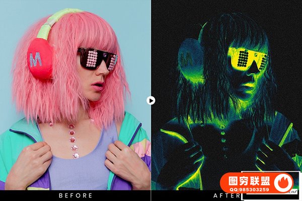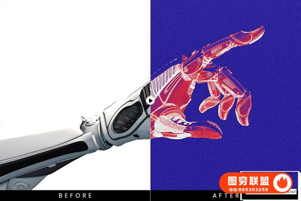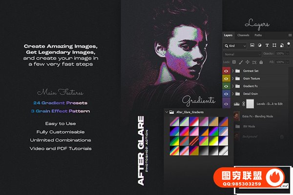 图穷联 » [PS动作]抽象艺术化赛博朋克双色调磨砂颗粒纹理渐变特效PS动作 After Gla
