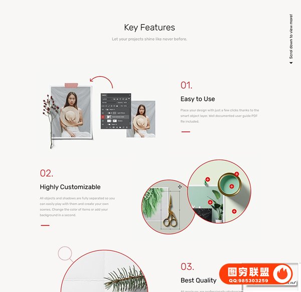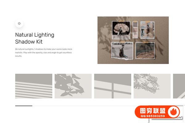 使用我们的 Moodboard Mockups Scene Creator 让您的情绪板演示更具吸引力。您可以轻松旋转项目、更改颜色并添加您的设计。调整光影不透明度以获得不同的对比度。为了让您有一个更好的开始,我们制作了一些可以使用的预制场景。只需将设计替换到智能对象层,点击保存即可。此包带有 26 种自然阳光/阴影,使您的场景看起来更逼真。