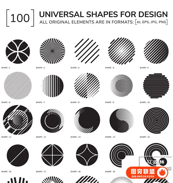 100 种形状(EPS10、JPG、透明 PNG – 5000×5000 像素、300 dpi)、RGB