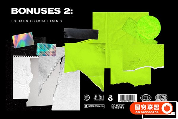 带有奖励的单独文件夹:JPG 纹理、PNG 撕纸、贴纸、徽标