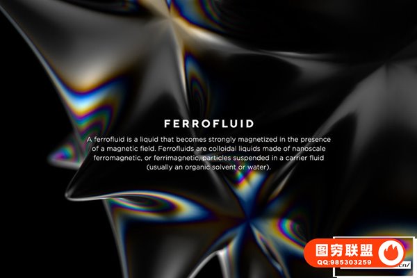 神奇的磁性液体 Ferrofluid 启发了这组 3D 图像。铁磁流体是一种在磁场存在下会被强烈磁化的液体。铁磁流体是由悬浮在载体流体(通常是有机溶剂或水)中的纳米级铁磁或亚铁磁颗粒制成的胶体液体。这些实验性图像适用于各种项目,如包装设计、专辑封面等。