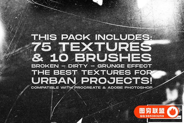 75 种纹理作为垃圾 – 肮脏的效果,您也可以与包含的破碎纹理结合使用。控制Procreate 和 Photoshop 的 10 个画笔,创造出令人惊叹的设计。