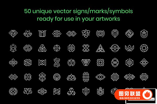 50 个高质量独特的抽象标志/标记/符号。使用它们来创建身份、品牌、海报、印刷品、艺术、图案等。