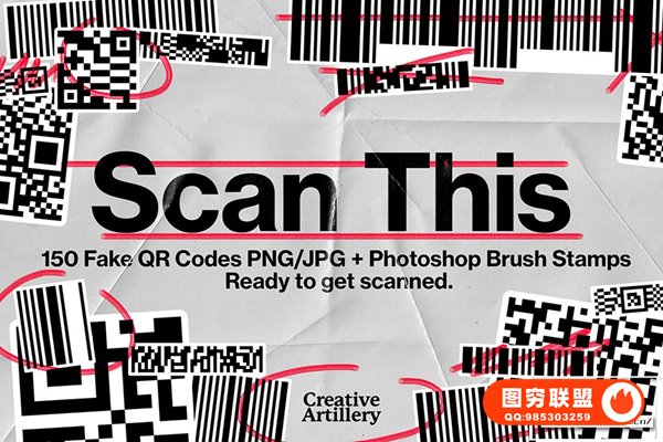 [图片素材]150个扫描二维码条形码QR码图形设计排版PNG素材+PS笔刷 Scan This – PNG + Brush