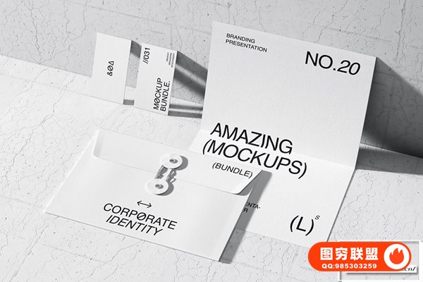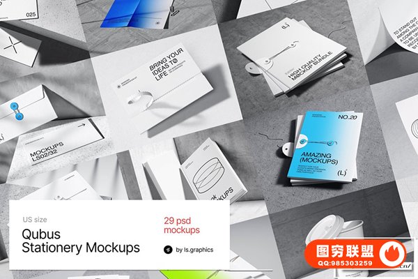 图穷联 » [PS样机]29套名片信封纸杯信纸档案袋轻奢办公VI文具贴图PSD样机 Qubus: