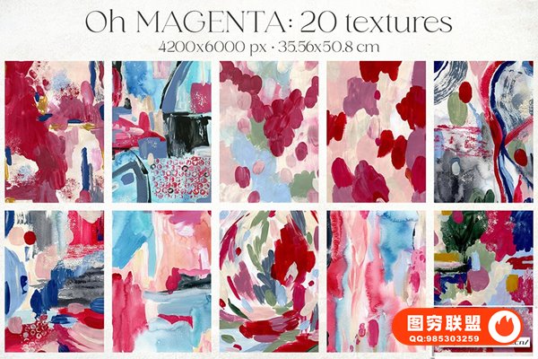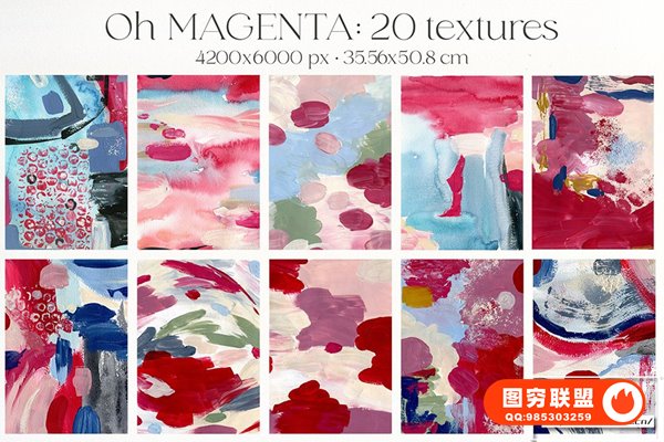 [图片素材]20张洋红色丙烯酸水彩亚克力数码纸手绘纹理艺术设计图片素材 20 Viva Magenta Watercolor Acrylic Digital Paper Textures