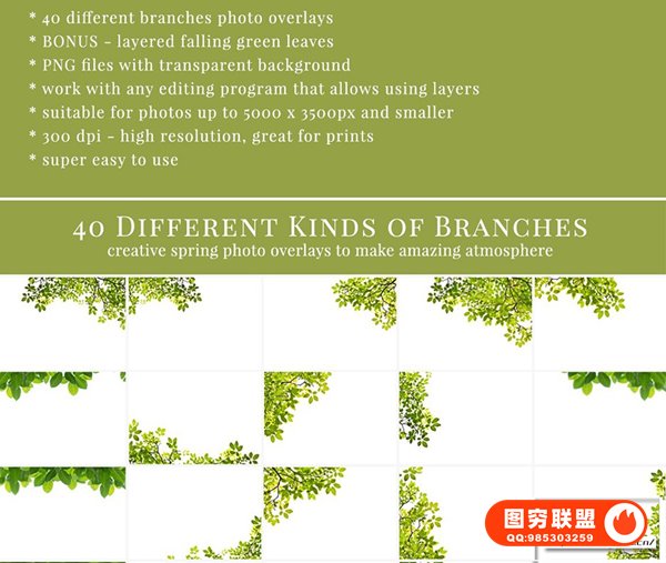 [PNG素材]40张春天绿叶树叶前景遮挡创意摄影照片叠加PNG素材 Green Branches Photo Overlays