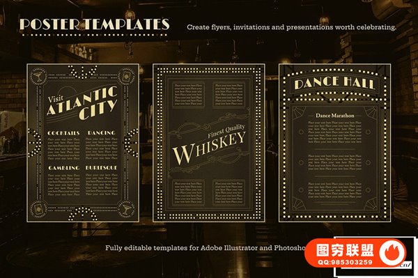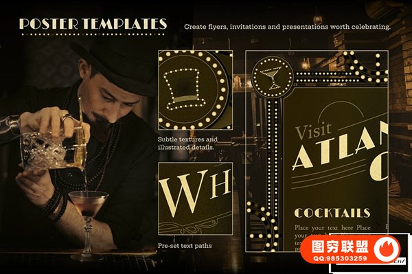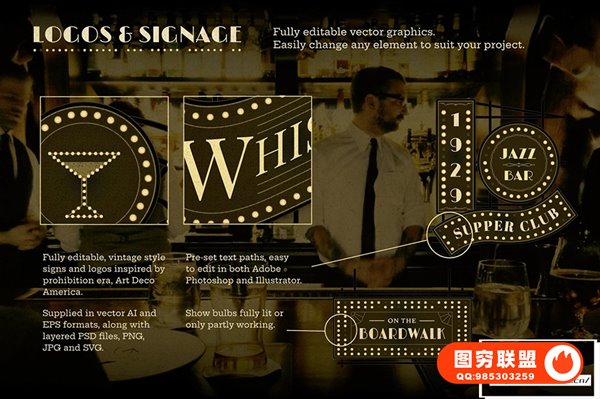 对于经典美国酒吧、舞厅和爵士乐俱乐部的粉丝来说,这是一个完美的模板集合,可帮助您创建自己的绝妙设计。借助预设的文本路径、矢量图案、纹理、插图元素和可变灯泡布局(有关更多信息,请参见下方视觉效果),此包是为复古主题活动创建海报、网站或品牌的任何人的绝佳资源。