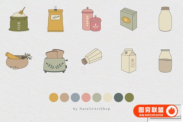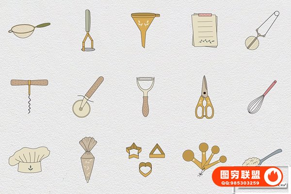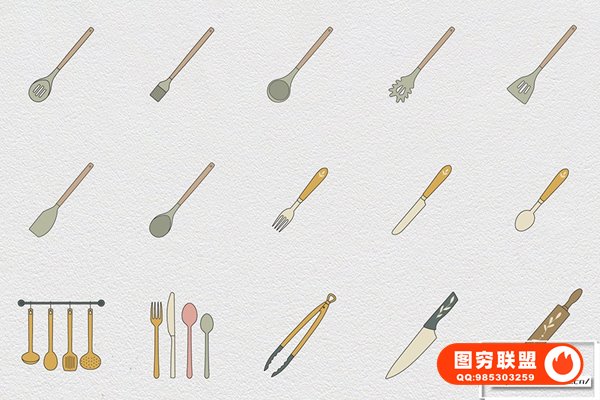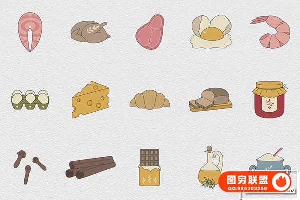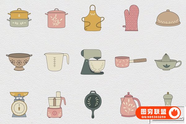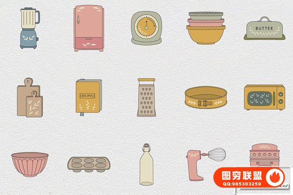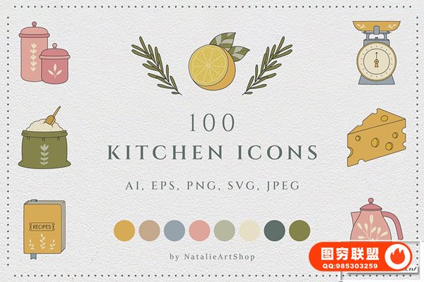 图穷联 » [矢量素材]100个餐饮厨房餐厅餐具电器食谱蔬果蛋奶矢量插画图标设计素材 Kitch