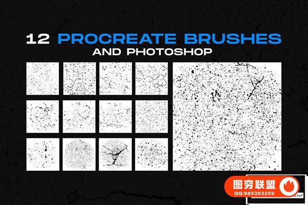 为了更容易操作,每张图片都是黑白的。并且我添加了 50 个新纹理矢量图,为 Procreate 和 Photoshop 添加了 12 个画笔, 组合或使用您需要的一个部分。
