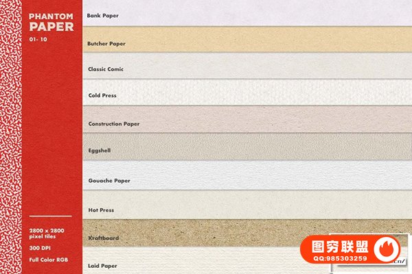 种类繁多。没有重复或无用的纸张纹理。以下是我们提供的多种纸张质地:牛皮纸、经典漫画纸、冷压纸、建筑用纸、蛋壳纸、水粉纸、热压纸、牛皮纸、直纹纸、木乃伊纸、新闻纸、洋葱皮纸、纸袋、Pea-Chee文件夹、抹布纸、宣纸、种子笔记本、有斑点的牛皮纸、贸易抹布和未涂层的火柴盒。