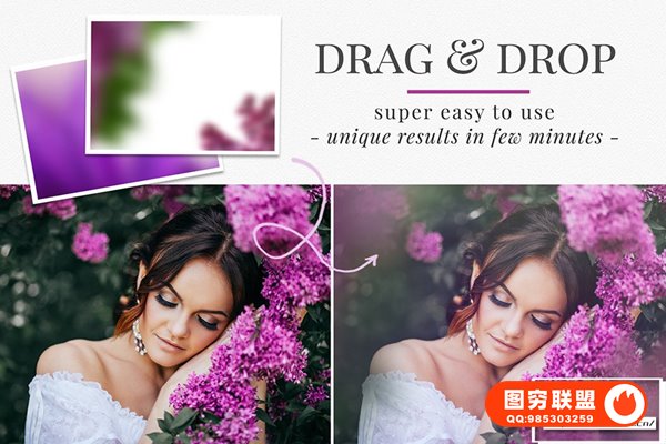 梦幻般的淡紫色照片叠加层,创意淡紫色照片叠加 – 非常适合迷你会议、时尚照片、肖像等。非常适合春季照片 – 淡紫色模糊前景和魔法薄雾覆盖,风格惊人的华丽场景与浪漫的气氛。任何允许使用图层的编辑软件中工作,在几秒钟内获得原始结果。