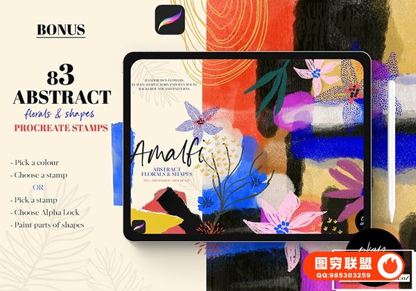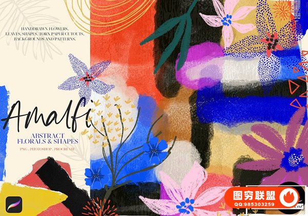[图片素材]80多种板画水粉画手绘花草抽象涂鸦艺术形状水彩背景+Procreate笔刷 Amalfi: Abstract Floral & Shapes