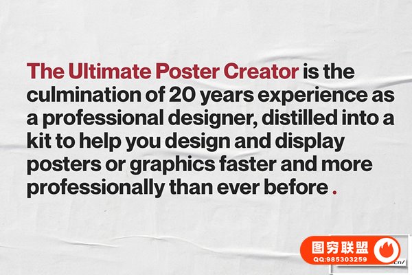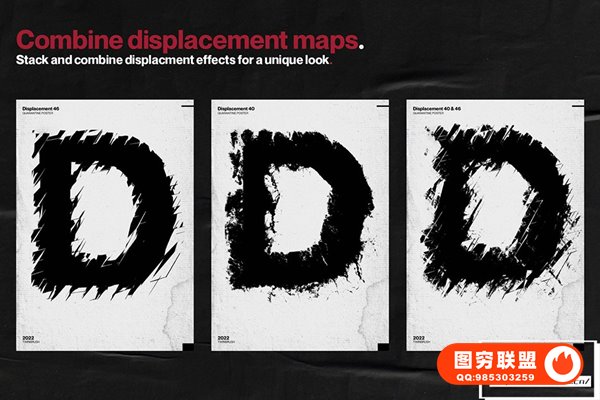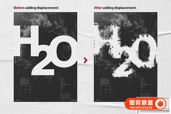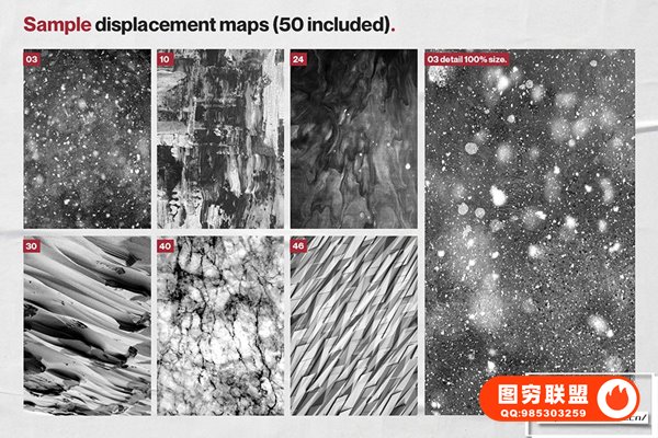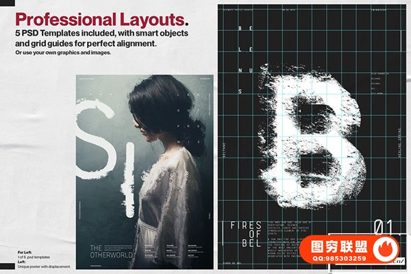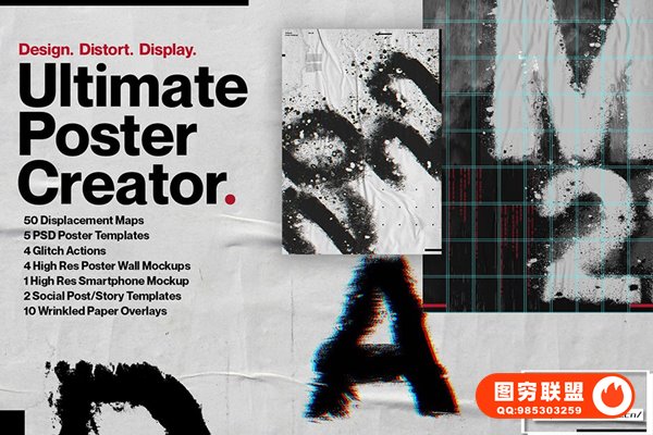 Ultimate Poster Creator 不仅包含50 张高分辨率置换贴图,可为您的设计增添令人难以置信的趣味性和动态感,而且还有5 个专业设计的 .Psd 海报模板。