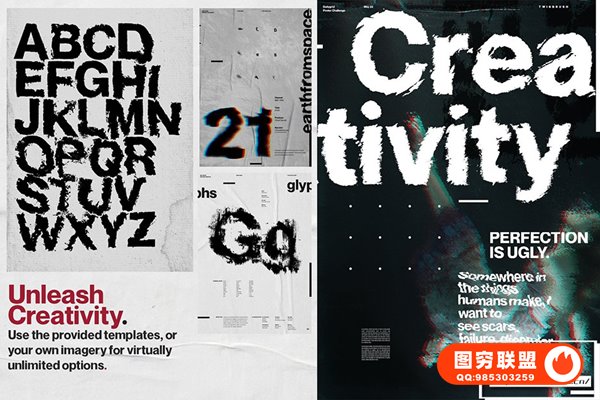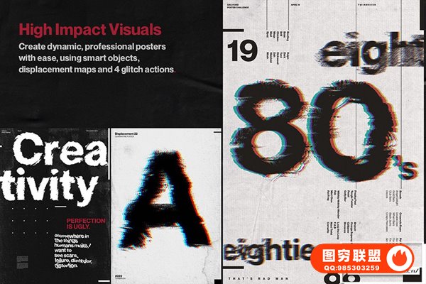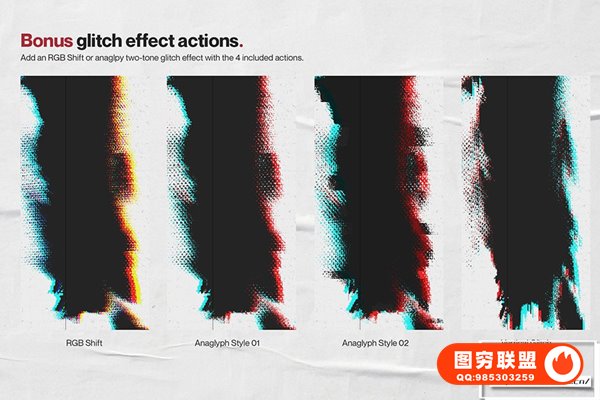 还包括 10 种高分辨率皱纹纸纹理,可用于为您的设计赋予额外的个性,以及 4 种故障动作以提供额外的冲击力!