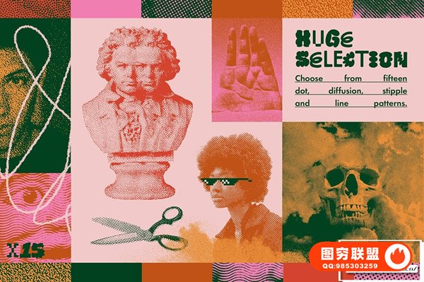 种类繁多的半色调图案,包括点、点彩、噪点、颗粒和线条。