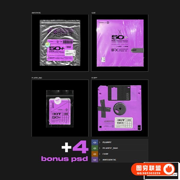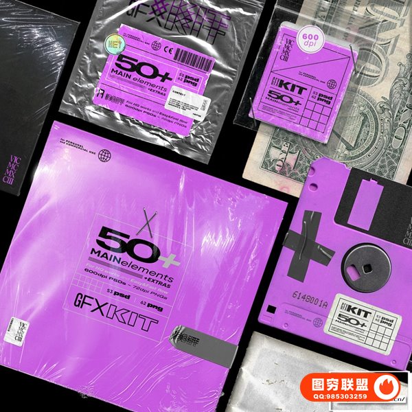 [图片素材]100+专辑封面塑料薄膜软盘胶带铝箔袋包装做旧贴纸火柴盒等复古元素PS设计套件 Vicmcmxciii – GFX KIT 50+ Elements
