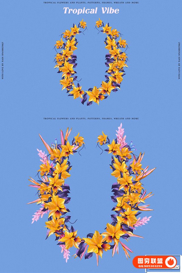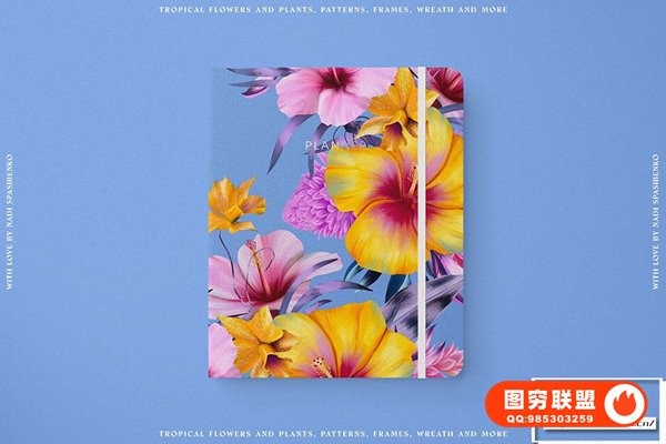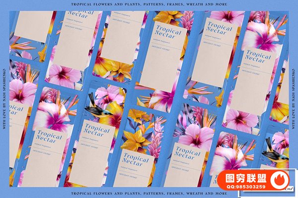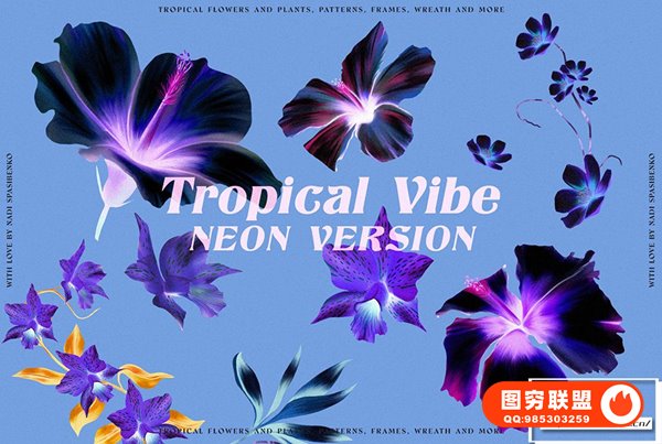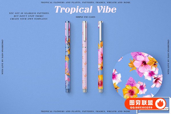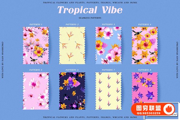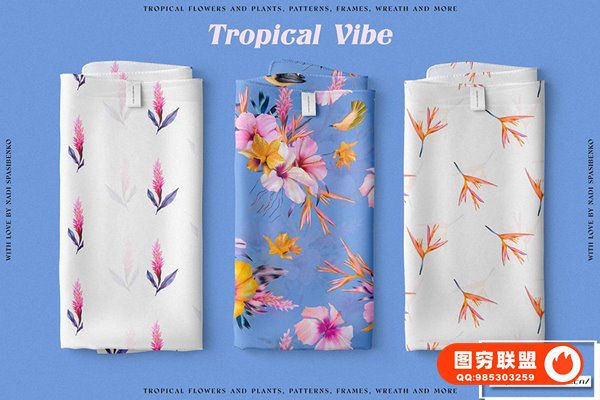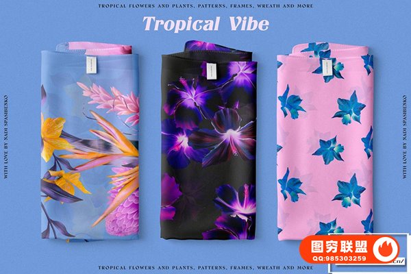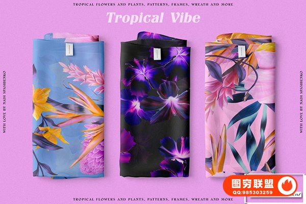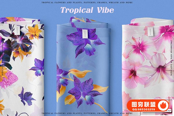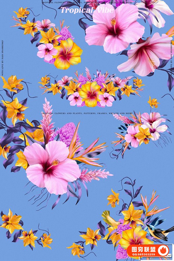 在清新时尚的夏威夷呼吸新鲜空气。使用Floral Tropical Vibe,您将获得丛林和热带花卉的新化身,明亮多汁的组合。您可以创造大胆的产品:衣服、壁纸、文具、床单和许多其他产品。您会得到颜色和花形的有趣组合。