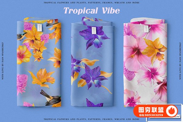 10个无缝美丽图案(有天堂鸟、木槿和花朵)您可以在丝巾上看到图案