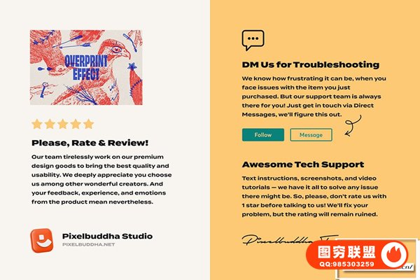 这是一种叠印效果(顺便说一句,包括 4 种风格),这意味着两种轮廓颜色重叠,为它们接触到的任何东西带来一种蹩脚、复古的风格。如您所知,复古氛围如今很流行,而且您肯定知道它们有多么多样化。衣服?当然!杂志的东西?毫无疑问!电影和音乐视频海报?看看更大的图景。这些效果可以在任何地方使用。Old Master OverPrint 以 PSD 文件形式提供,正如我们之前提到的,在这套中,您会发现4 个变体,但除此之外,您还将获得10 种纸张纹理和一个帮助文件,以防您遇到一些技术问题。