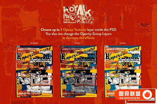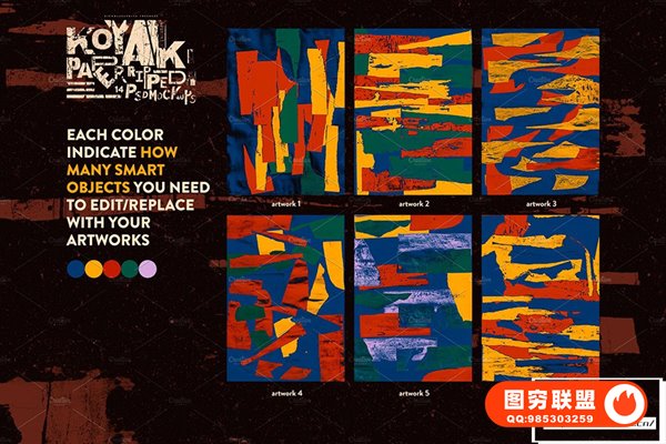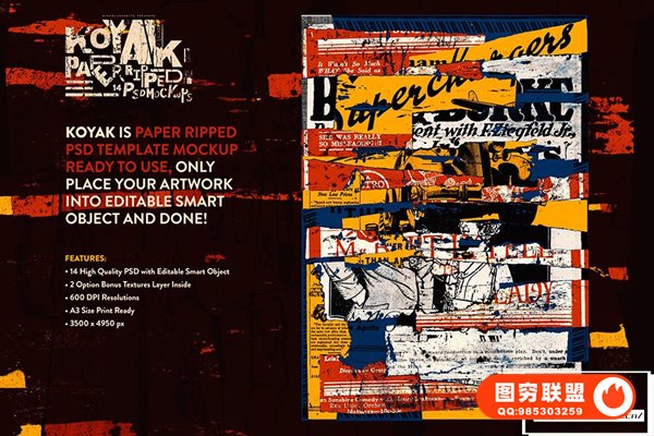 每个智能对象,您都可以用任何东西填充它,从印刷作品,或者只是抽象艺术。您可以轻松获得撕裂的纹理,无需修改,只需调整打开/关闭其中的纹理层即可。Koyak 也适用于任何一种颜色,黑色和白色,彩色也适用。模板内撕开的纸张使颜色和艺术品的动态融合成一件艺术品。