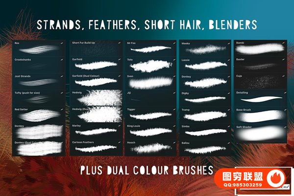 笔刷多种多样,有的可以产生光滑的毛皮效果,有的有卡通风格,有的有凯特双色,可以给你带来多种多样的效果。单独或组合在一起,您可以获得一些令人惊叹的效果,无论是现实的动物还是奇幻的艺术。它们对鸟类也很有效。