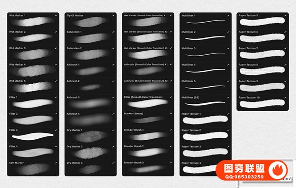 27 个标记(湿标记、填充标记、软标记、饱和标记、喷枪标记、干标记等)