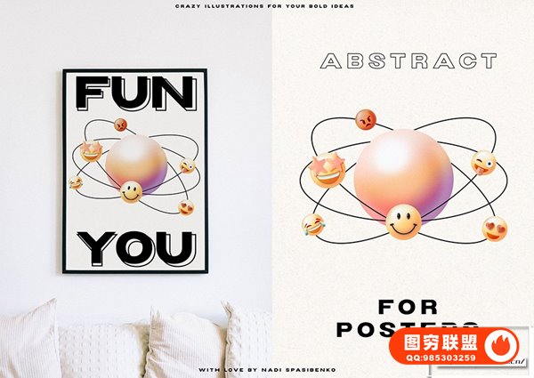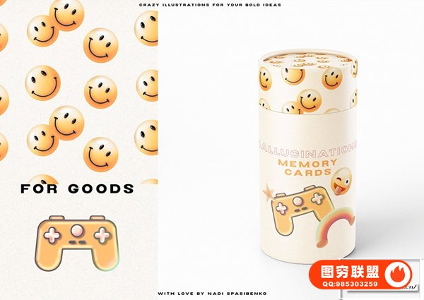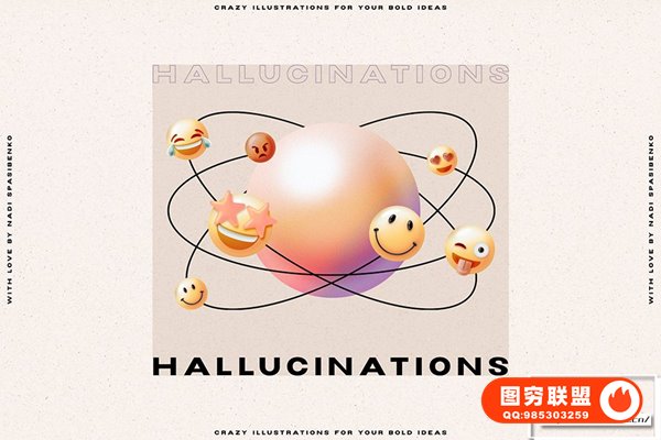 幻觉是一种新的插图方法。你会得到不寻常的带有渐变的体积插图。人们会觉得你身处一片神奇的土地,或者这是你的幻觉。抽象形状、表情符号等等。只需查看此自我缩略图预览即可。