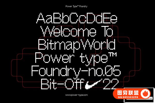 OffBit是一种从 Bitmap 派生的字体类型,每个框都有不同的变体。位图一词来自计算机编程术语,它的意思只是位图,即空间映射的位数组。现在,它与 PowerType 一起通常指的是类似的像素阵列概念,这些像素在空间上映射成各种形状,例如点和其他模型。这种字体与计算、平面设计、海报或其他媒体的主题相匹配,所有这些都可以组合。