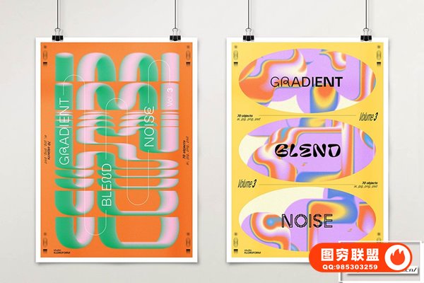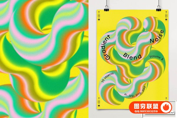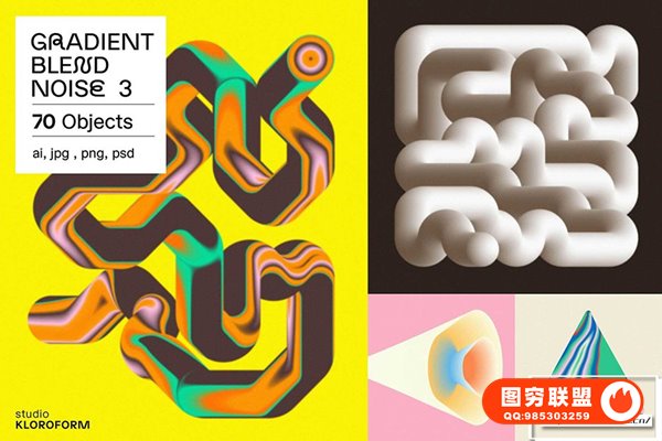 [图片素材]70款潮流创意怪诞抽象迷幻渐变立体几何图形艺术海报设计ai素材 Gradient Blend Noise 3