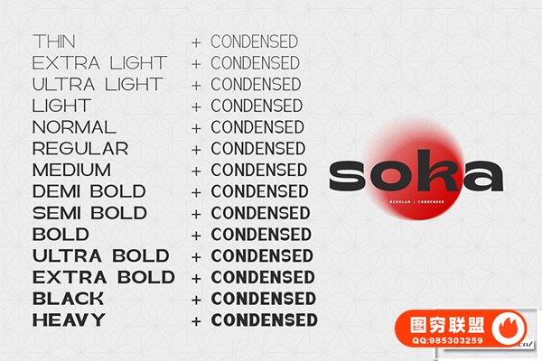 Soka 字体包含 522 个字形,以及许多独特且有趣的替代选项。另外,还有一个很酷的无衬线字体系列,适用于标题和描述文本,从细到粗,从细压缩到粗压缩。在海报预览中,所有字母均采用 Soka 字体。
