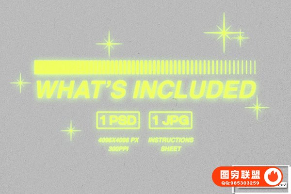 该模板以 PSD 文件形式提供,具有智能对象替换功能,您可以在其中添加您的设计。效果的颜色是可编辑的,您还可以选择调整垃圾叠加的不透明度,以及通过图层效果和智能滤镜编辑发光量。