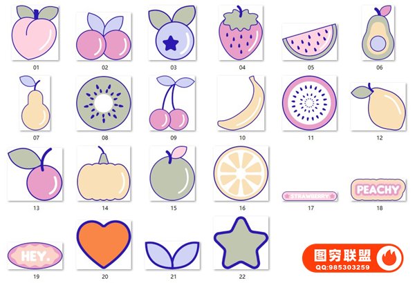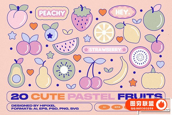 20 张可爱的柔和水果贴纸,适合广告、包装、拼贴艺术、剪贴簿、贴纸、海报、明信片和所有创意设计。由于矢量形状和组织良好的图层,所有元素都很容易编辑、自定义和调整大小。EE-T2TCKWP