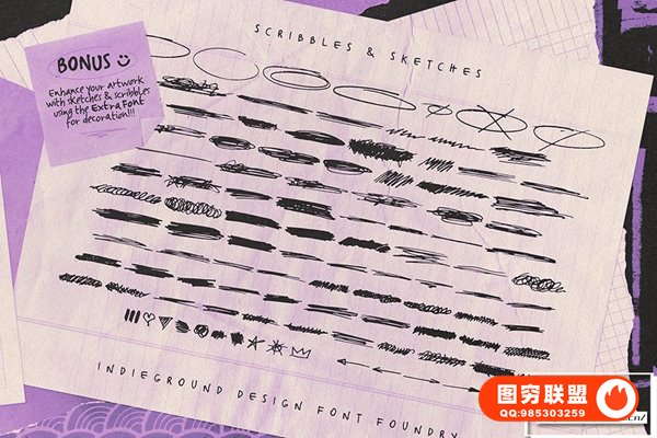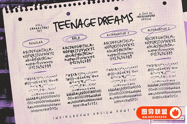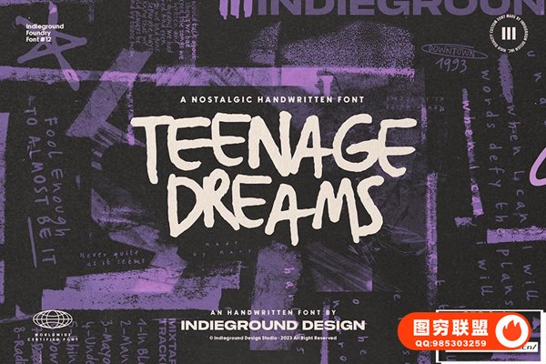 Indieground 的青少年梦想字体这种手写字体非常适合带回 90 年代的怀旧氛围。凭借其独立性质,这种蹩脚字体将为任何创意项目增添一丝自发性和风格。这种字体重现了 90 年代青少年时期的氛围,当时我们听着 Smashing Pumpkins,穿着 Chucks,去参加独立演出。我们喜欢回想那个充满奇迹、发现和想象力的时光,《少年的梦想》非常适合将它们带回到我们的创意项目中。通过在标题和封面中混合 4 个不同版本,实现逼真的手写效果,立即创建具有另类、亲密态度的印刷艺术品。最重要的是,我们还添加了这种梦幻字体的第五个奖励版本,您可以将涂鸦和图画添加到您的作品中。这边走,您将获得蹩脚的剪贴簿效果,同时为任何项目增添强度和风格。当在黑暗、嘈杂的背景上使用时,或者在图像和照片上使用时,它非常棒!