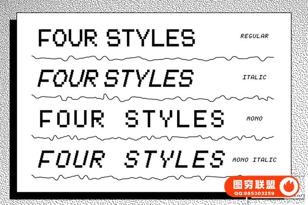Tickerbit 像素字体是一种现代像素字体,有 4 种样式。这种字体非常适合复古或现代展示。它适用于标题或正文。多语言支持。非常适合具有复古感觉的徽标、社论、服装和包装设计。这种有趣的字体适用于大尺寸和小尺寸。包括等宽、斜体和单斜体样式。