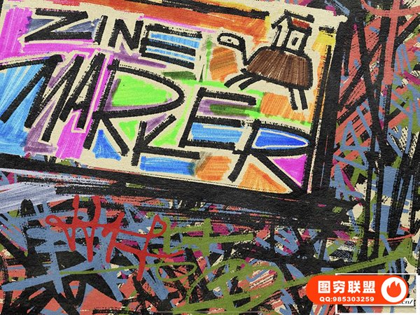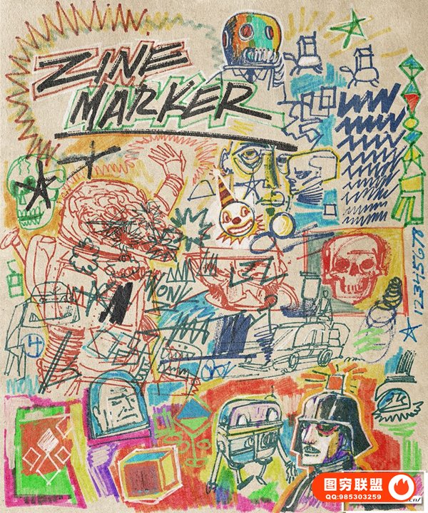 我认为用它们绘画的行为与其他笔不同 – 我制作了玻璃笔和毡尖笔,以便在角落里有一点出血。如果你把笔放在纸上 – 当你在刚刚做的标记上画一条线时,它就会像真正的墨水一样渗到纸上。大多数这些画笔的边缘都没有锯齿 – 但它们是高分辨率的 – 这样,选择就干净,并且我在构建丝网印刷分色时使用其中一些,所以我想要非常清晰的边缘。而且,它们看起来更像是影印的 – 杂志风格,我喜欢这一点。彩色 Zine 记号笔具有独特的颜色堆积,使东西看起来非常手工制作 – 我提供了一些记号笔托盘来帮助绘制较浅的颜色以及一些有关如何使用它们的说明。