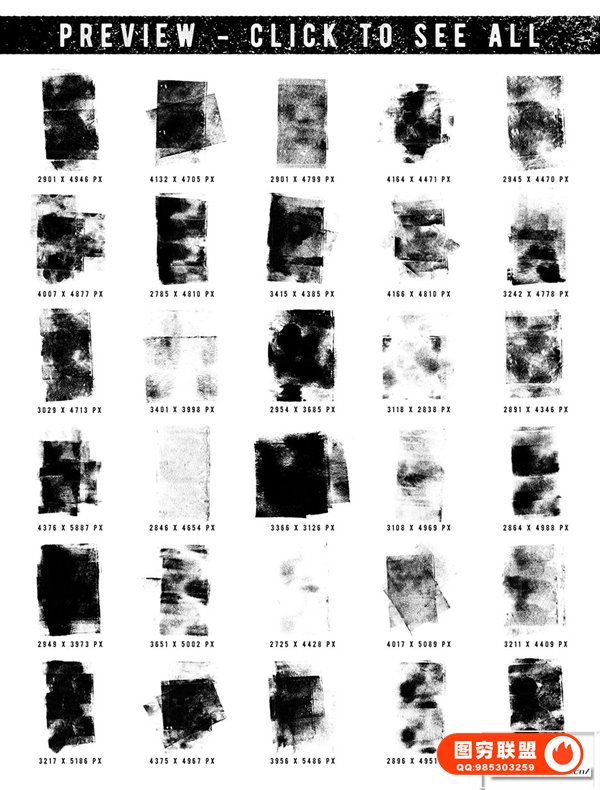 这些纹理非常适合用作背景,或用作蒙版,为文本、徽标和其他设计添加纹理。可以将它们组合起来以获得自定义结果。