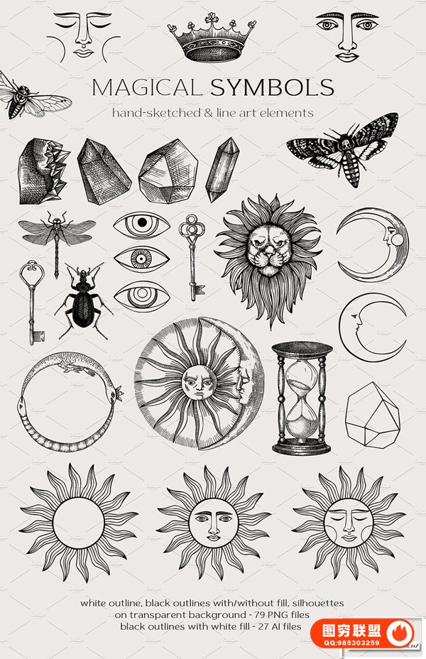 炼金术是一个现代图形集合,包含古代符号、炼金玻璃器皿和现代标志元素。使用此套件中的手绘草图和线条艺术项目,您可以创建徽标、贺卡、纹身、规划师、海报、塔罗牌、印刷品、贴纸、婚礼请柬或品牌设计。
