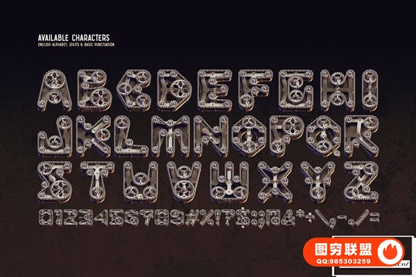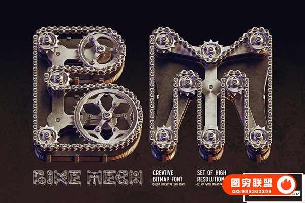 你好!呈现蒸汽朋克风格的字体集 – Bike Mech。这是一款由自行车齿轮和链条制成的 3D 渲染高品质字体。首先,它是一种彩色位图 OpenType-SVG 字体,可以用作常用的 OTF 字体。考虑到仅支持英语和基本标点符号,请查看包含所有可用字符的屏幕截图。
