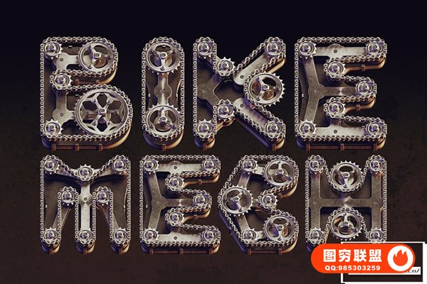 图穷联 » [字体]赛博工业蒸汽朋克风机械齿轮链条元素3D渲染创意设计彩色字体 Bike Mec