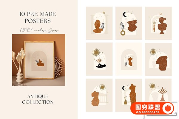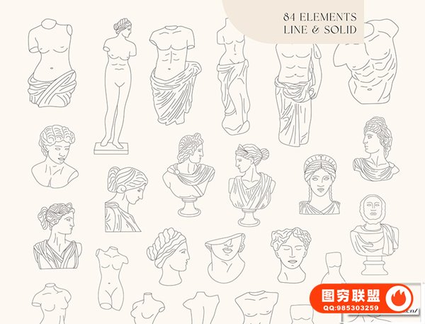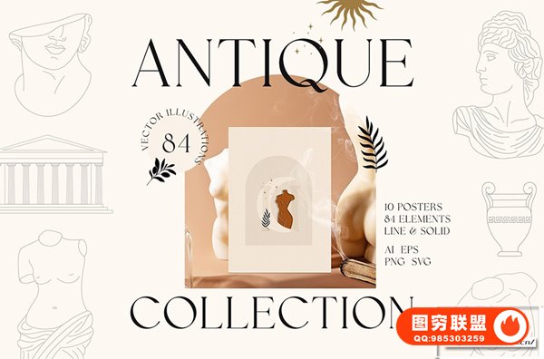 我很高兴展示我的新系列!古董收藏– 84 个轮廓和立体插图以及 10 个墙壁艺术印刷品。该系列包括神话人物、著名雕像、手、拱门、树叶和徽标框架的手绘插图。该系列非常适合网络和印刷、徽标、社交媒体帖子、邀请函、蜡烛和家居装饰品牌、珠宝、博客等等!